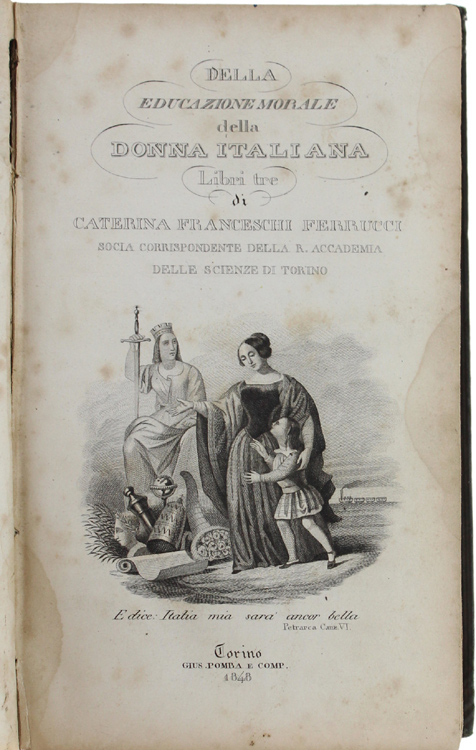 Il frontespizio di Della educazione morale della donna italiana, opera di Caterina Franceschi Ferrucci, ritrae in secondo piano un’Italia turrita che si appoggia ad una spada. Sotto di lei sono presenti, tra gli altri oggetti, una tiara papale e una cornucopia. In calce: “e dice: Italia mia sarà ancor bella” (Petrarca).