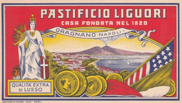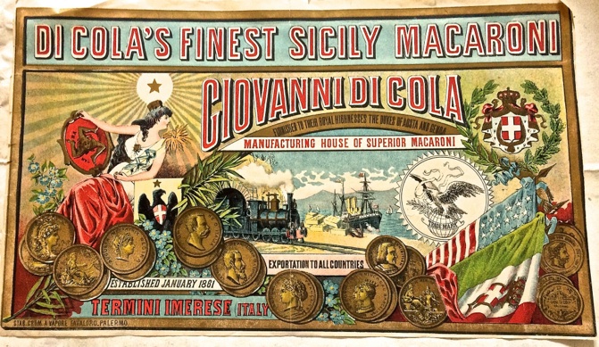Un’Italia turrita e stellata è raffigurata sulla sinistra dell’etichetta pubblicitaria del pastificio Giovanni Di Cola di Termini Imerese. Il pastificio esporta i propri prodotti negli Stati Uniti.
