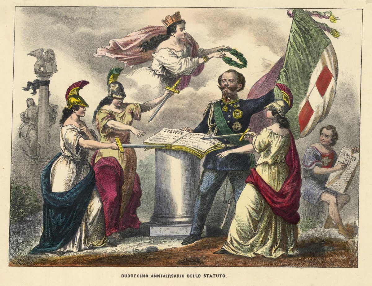 L’Italia turrita cinge con una corona d’alloro Vittorio Emanuele II. Accanto al sovrano sono presenti le figure femminili della Toscana, dell’Emilia e della Lombardia; hanno il capo cinto da un elmo si cui è inciso il nome della regione. Dietro a Vittorio Emanuele II: sulla destra, un ragazzino a rappresentare il Piemonte: sulla sinistra il Leone di San Marco, simbolo della città di Venezia.