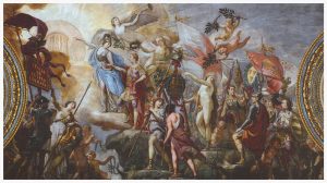 L’Italia siede su delle rovine romane ed il capo è cinto da una corona d’ulivo. Nella mano destra cinge una lancia con la croce papale, ovvero con le traverse di diversa lunghezza (la traversa centrale è più lunga).