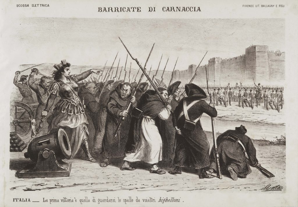 L’Italia turrita con armatura sta per dare fuoco alle polveri, incitando l’esercito e redarguendo gli ecclesiastici scansafatiche. In calce: “ITALIA – La prima vittoria è quella di guardarsi le spalle da voialtri bighelloni”.