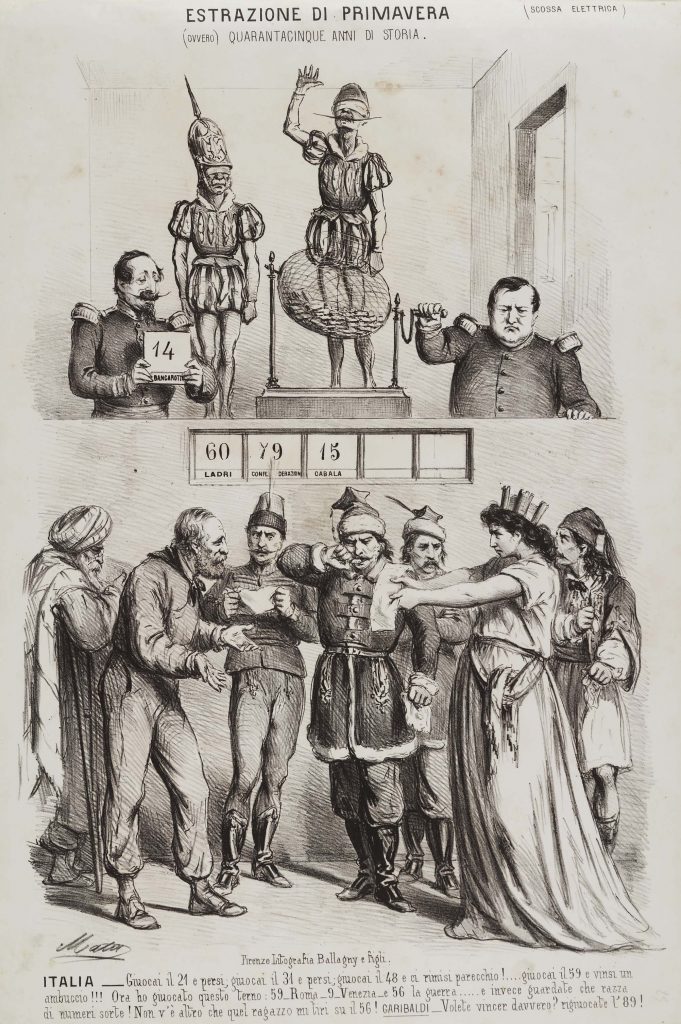 L’Italia turrita mostra, scura in volto, i numeri giocati che cronologicamente corrispondono ad azioni intraprese per l’unificazione del Paese. In calce: “ITALIA – Giuocai il 21 e persi; giuocai il 31 e persi; giuocai il 48 e ci rimisi parecchio!….giuocai il 59 e vinsi un ambuccio!!! Ora ho giuocato questo terno: 59_Roma_9_Venezia_e 56 la guerra….e invece guardata che razza di numeri sorte! Non v’è altro che quel ragazzo mi tiri su il 56! GARIBALDI-Volete vincer davvero? rigiuocate l’89!”.