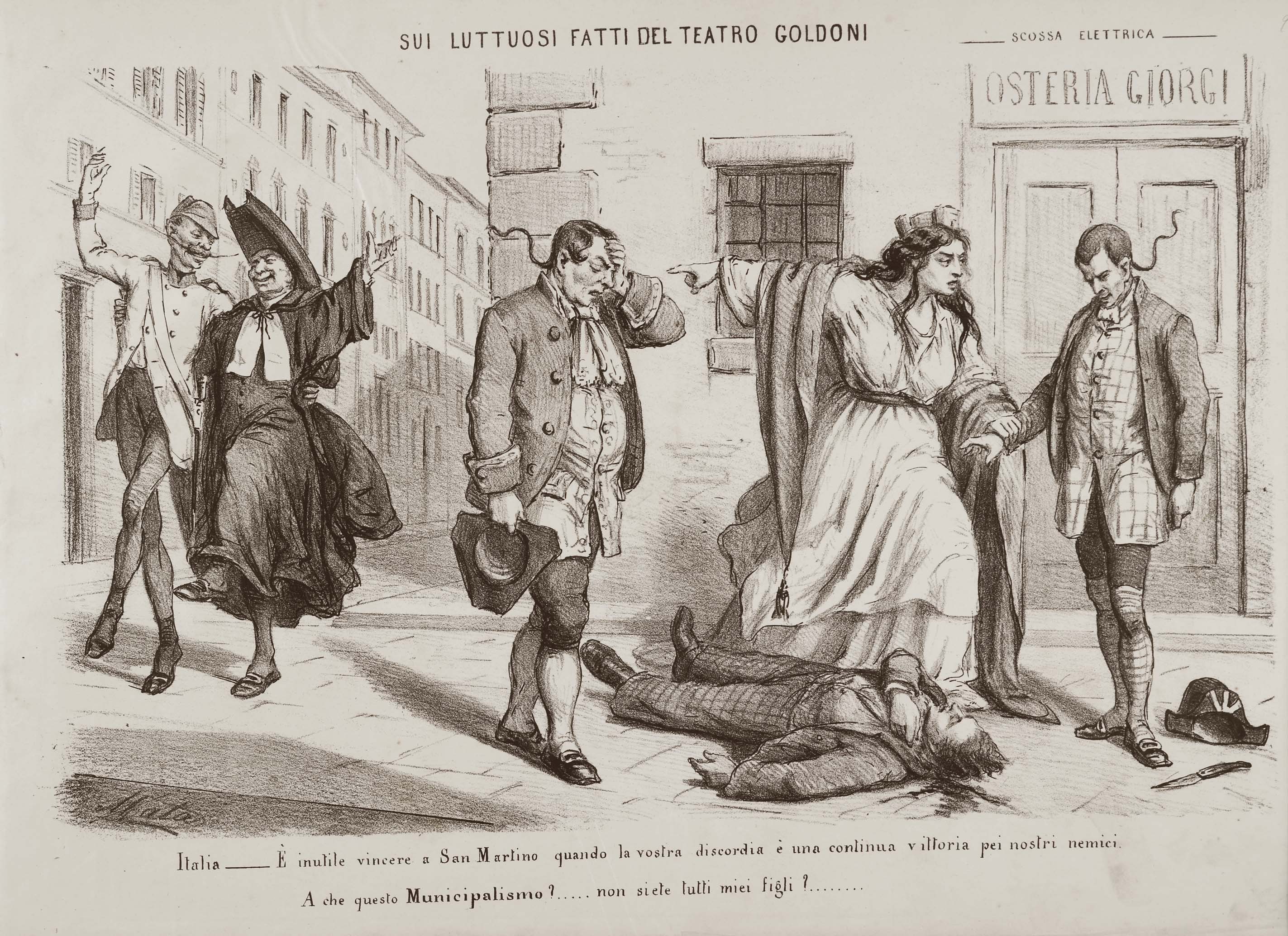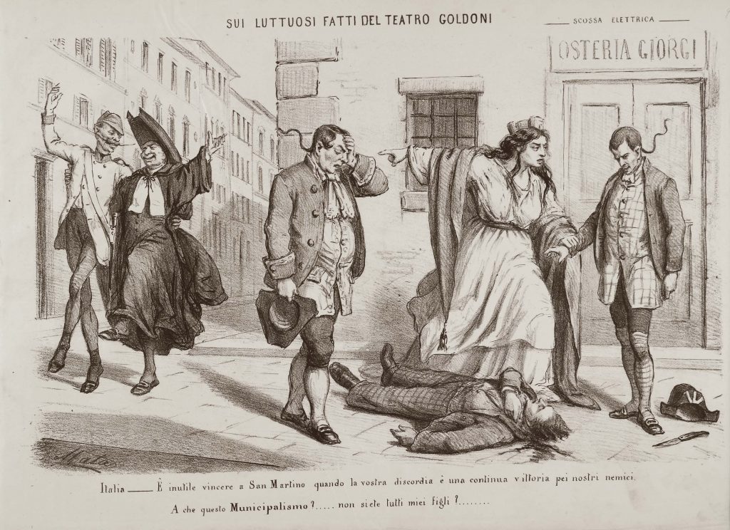 L’Italia turrita rimprovera un un uomo che ha appena commesso un delitto, tagliando la gola ad un compatriota. In calce: “Italia – È inutile vincere a San Martino quando la vostra discordia è una continua vittoria pei nostri nemici. A che questo Municipalismo?…..non siete tutti miei figli?……..”.