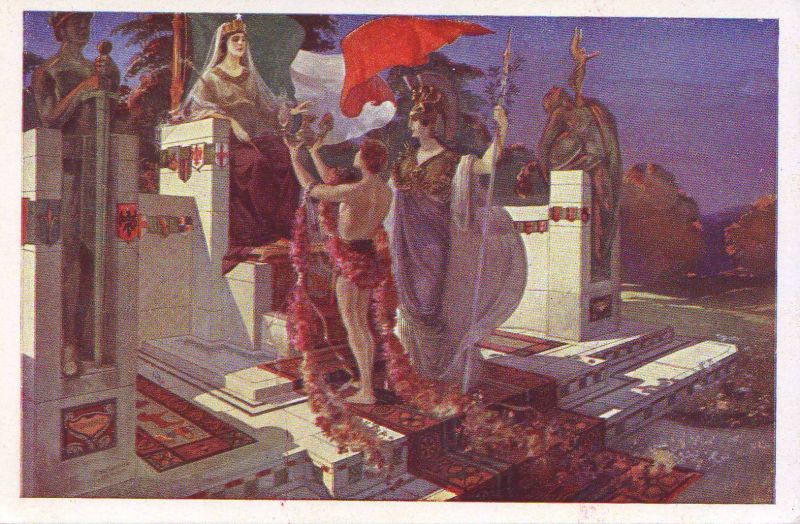 L’Italia turrita e stellata è seduta su un trono ed è intenta a ricevere l’omaggio di una lampada votiva da un giovane avvolto in un serto di fiori alla presenza della Dea Roma. La cartolina fa parte della serie “Buonsenso e tricolore”.