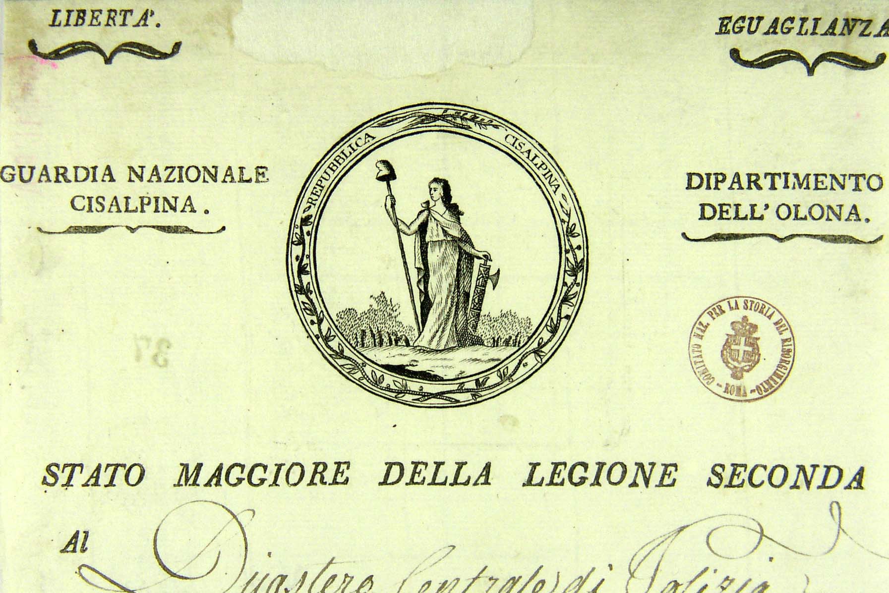 La figura femminile della Repubblica Cisalpina è rappresentata all’interno di un medaglione; tiene nella mano destra una picca, sulla cui sommità è posto un berretto frigio, e poggia la mano sinistra su un fascio littorio. La cornice del medaglione riporta la scritta “Repubblica Cisalpina”. Le parole “Libertà” e “Eguaglianza” sono scritte nella parte superiore della carta intestata, rispettivamente a sinistra e a destra del medaglione.