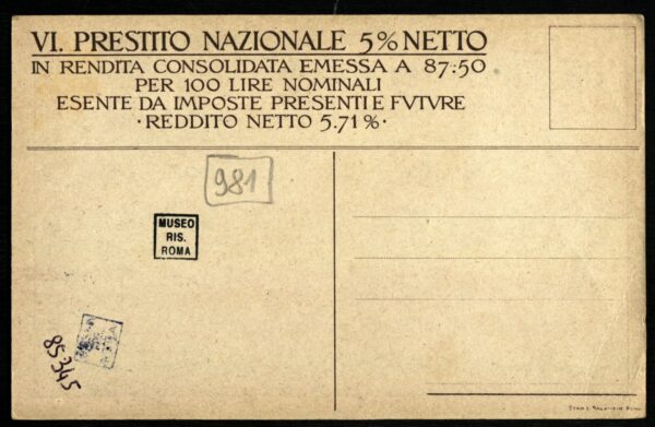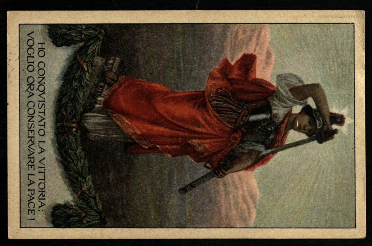 L’Italia vittoriosa con indosso corazza ed elmo rinfodera la spada.