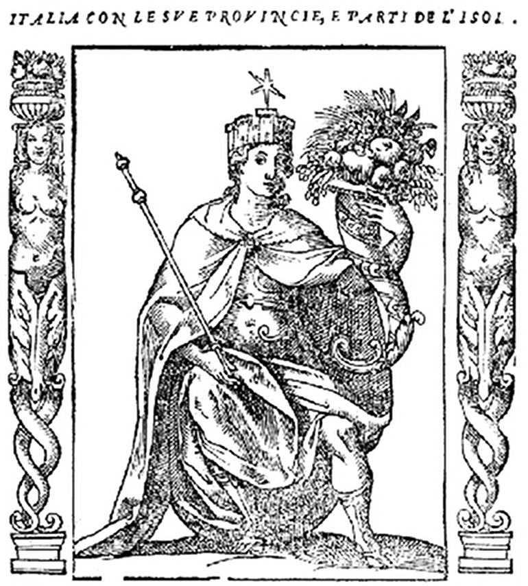 L’immagine dell’Italia è basata sui modelli romani (in particolare monete romane, presenti in numerose collezioni del tempo). Si tratta di una delle prime rappresentazioni dell’Italia turrita, stellata e con scettro. Nella mano sinistra tiene una cornucopia, simbolo della ricchezza e fertilità della terra; nella mano destra stringe uno scettro, simbolo del ruolo di dominatrice. Una stella sovrasta la figura, in riferimento al pianeta Venere, che nel cielo serale era chiamato Hespero, da cui Hesperia antico nome dell’Italia.