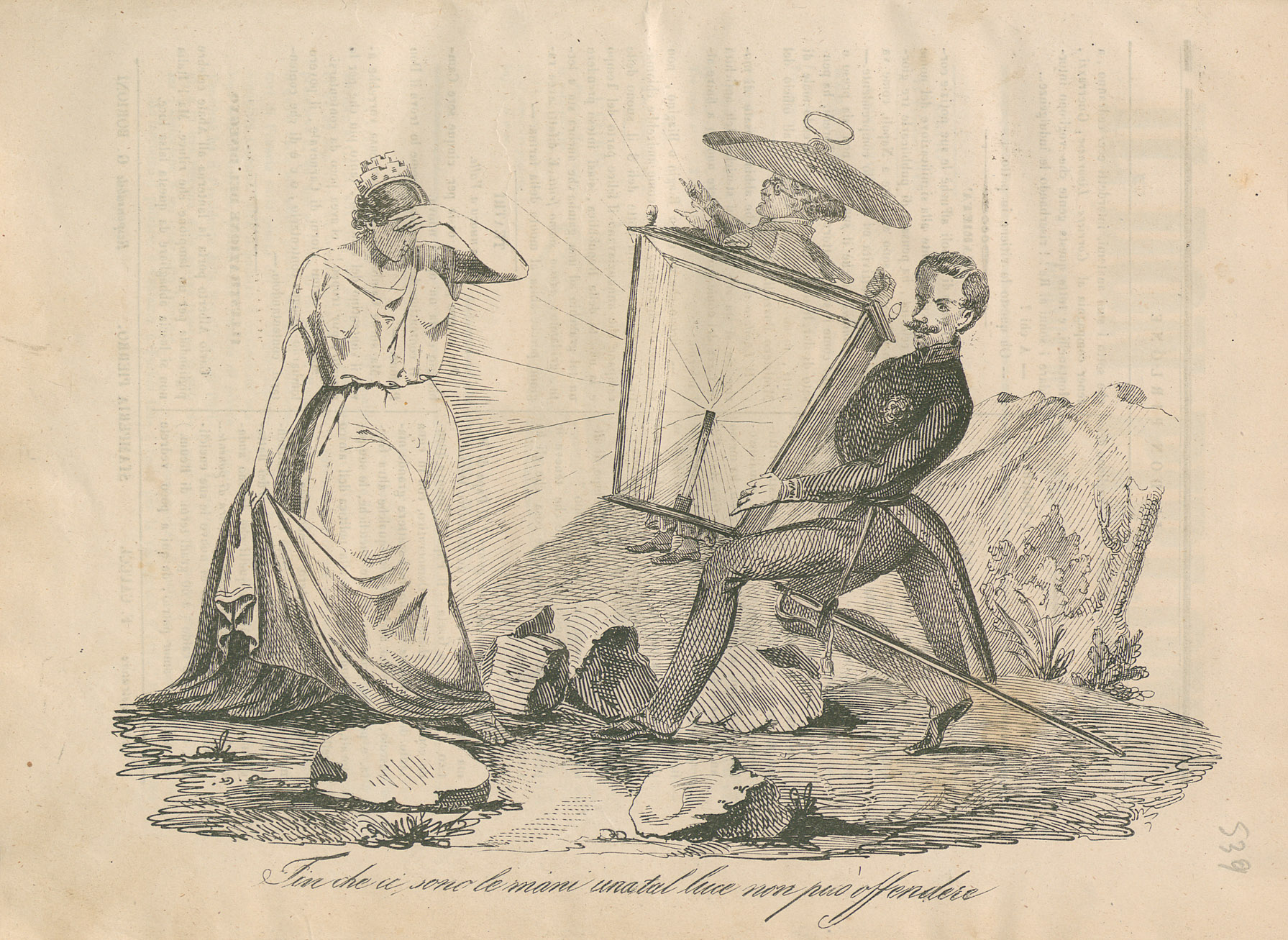 Carlo Alberto porta con sé una grande lanterna. Dentro quest’ultima è presente Gioberti che tenta di abbagliare l’Italia con troppa luce. L’Italia turrita si copre gli occhi con le mani. In calce le parole dell’Italia: “Finché ci sono le mani una tal luce non può offendere”.
