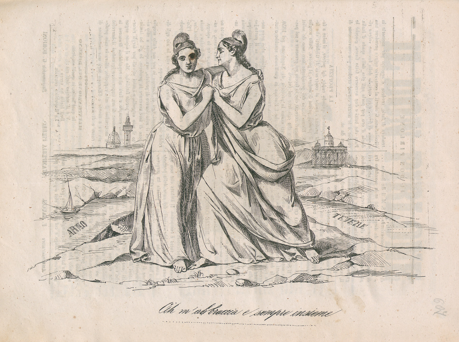 L’allegoria femminile di Roma e di Firenze/Toscana si abbracciano affettuosamente. Entrambe indossano il berretto frigio.