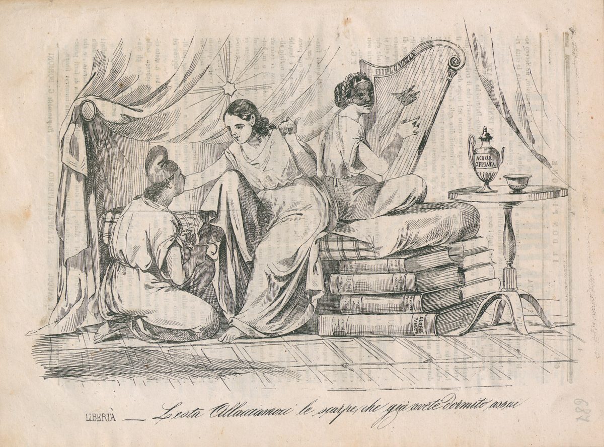 Sono rappresentate tre allegorie femminili. L’allegoria della Repubblica con sul capo il berretto frigio sprona l’Italia, con stella lucente sopra il capo, a destarsi, a seguire il suo esempio e le allaccia le scarpe. La Diplomazia suona l’arpa per addormentarla.