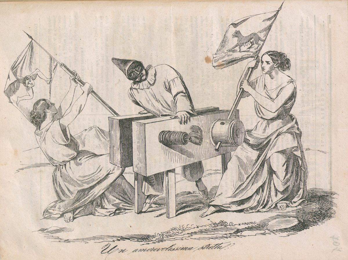 Le allegorie femminili della Sicilia e di Roma stringono in una morsa, con le aste delle loro bandiere, il Re di Napoli.