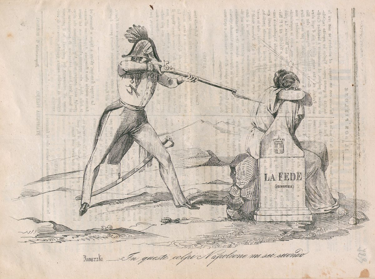 Radetzky spara a tradimento all’allegoria femminile del Piemonte, rappresentata con stella lucente sopra il capo.