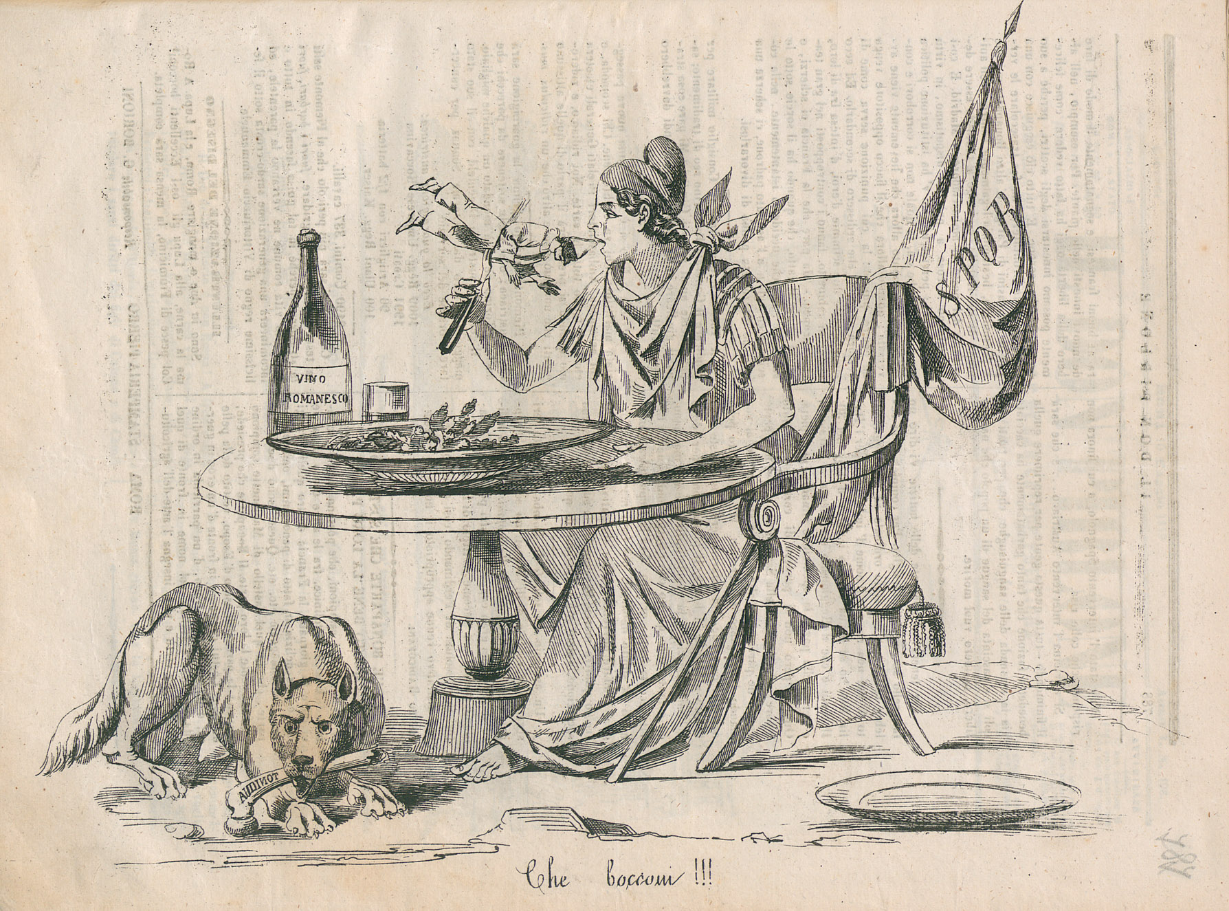 La Repubblica romana con indosso il berretto frigio mangia la maschera di Pulcinella, che probabilmente allude al Regno di Napoli. Sotto il tavolo la lupa rode un osso su cui è scritto Audinot [Oudinot], generale delle truppe francesi.