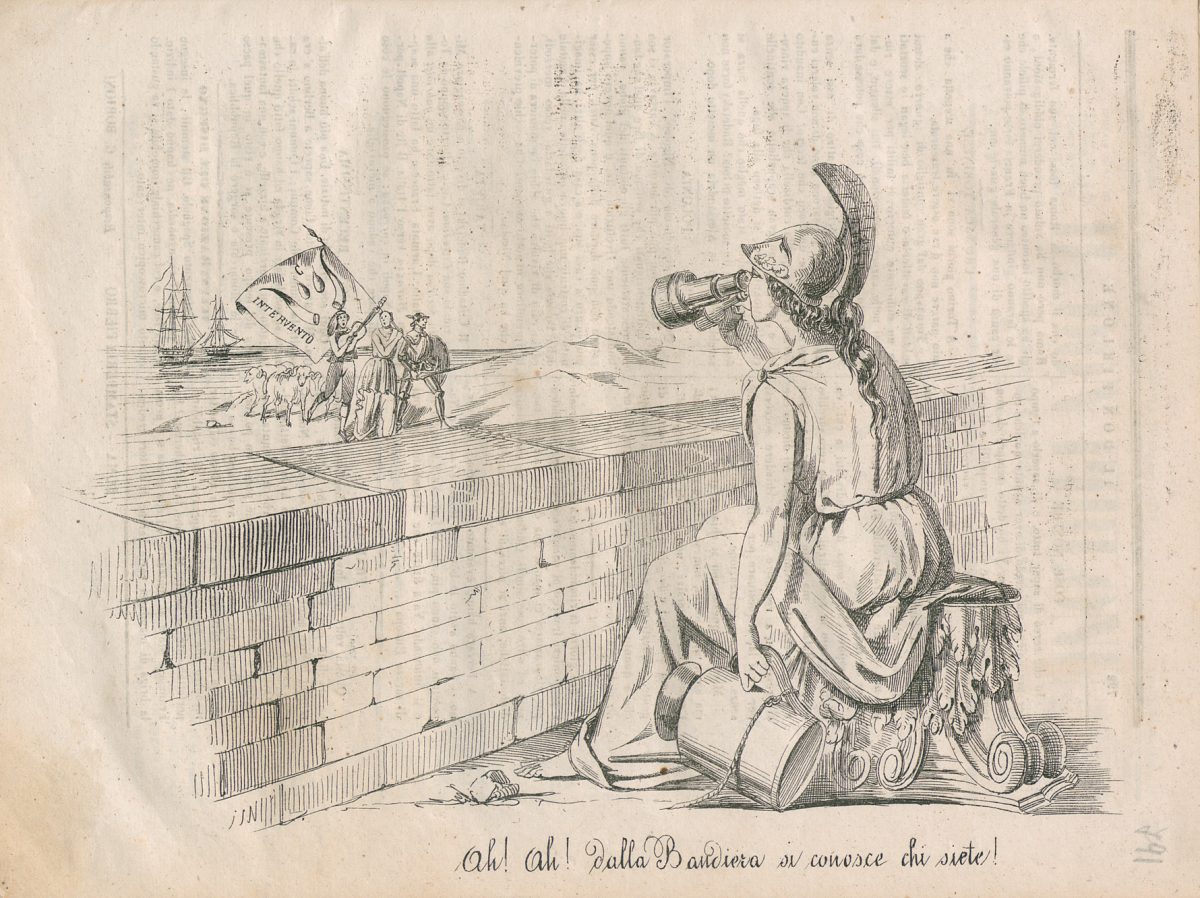 La figura femminile di Roma indossa l’elmo e guarda con il binocolo lo sbarco di alcuni soldati spagnoli. Questi ultimi sono riconosciuti, perché portano con loro una bandiera con disegnate delle corna.
