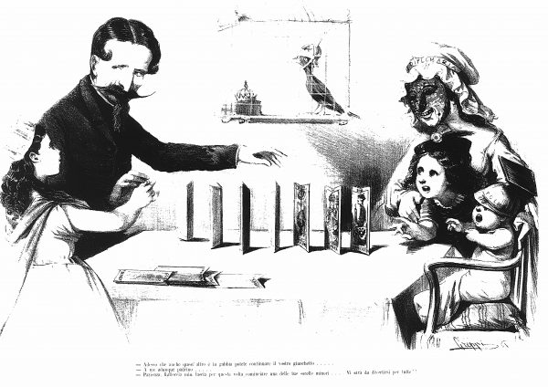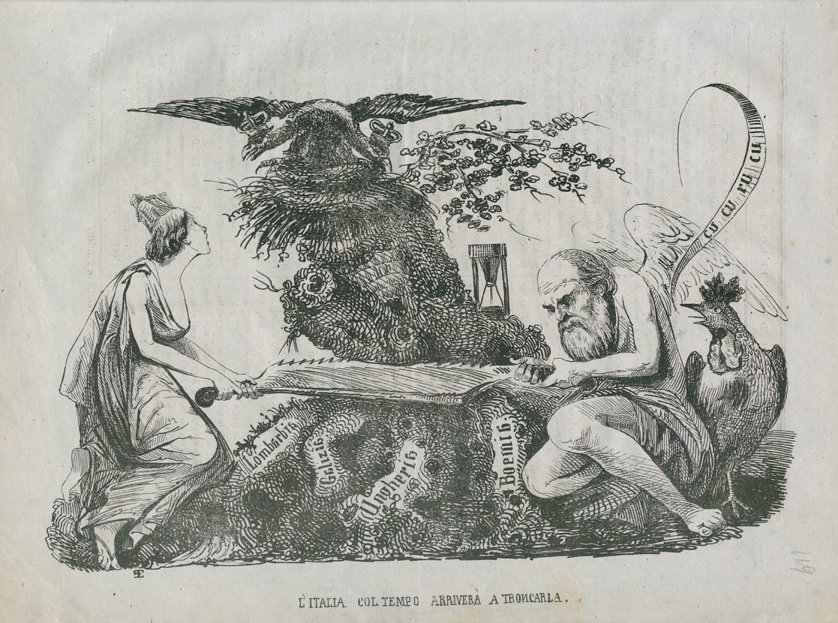 L’Italia turrita e il Tempo sono intenti a segare un albero su cui ha nidificato l’aquila bicipite austriaca. Sulla destra la Francia raffigurata come un gallo canta.