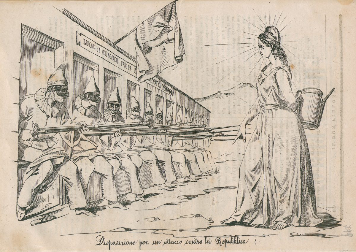 Il soldati del Regno di Napoli (rappresentati come Pulcinella) sono seduti alle latrine e sono pronti a sparare alla Repubblica romana. Sopra di loro sventola una bandiera con una lepre.