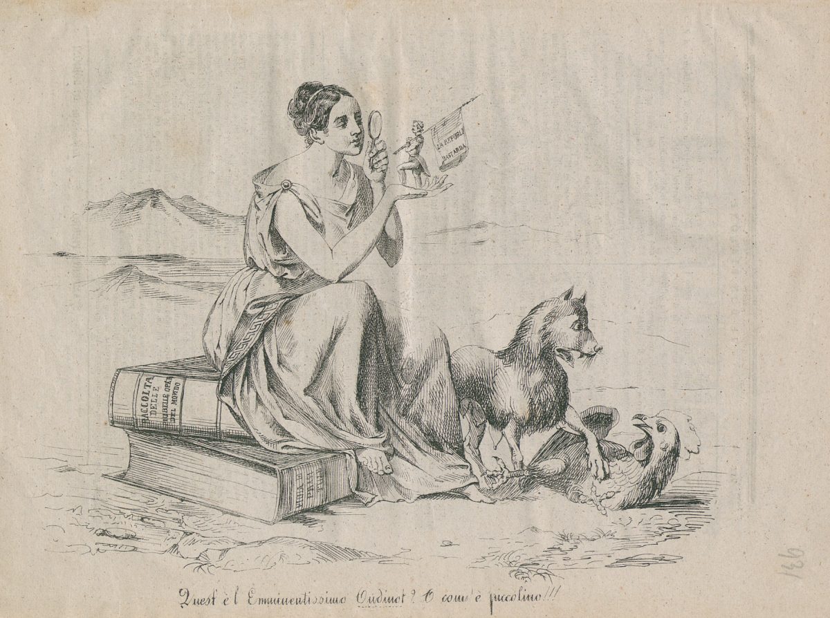 Roma osserva con una lente di ingrandimento il generale Oudinot. Accanto a lei la lupa sottomette un gallo.