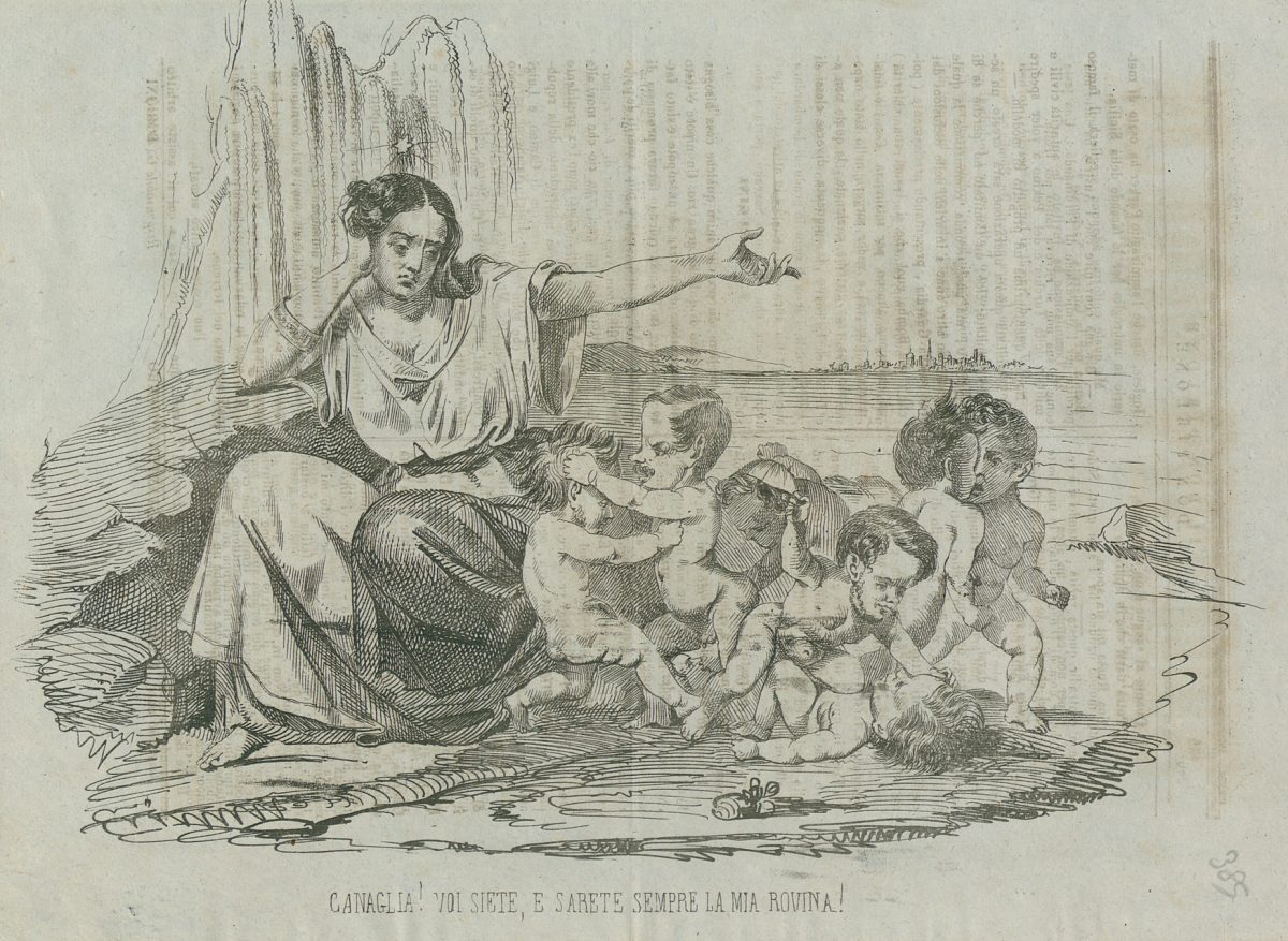 L’Italia stellata siede sconsolata a guardare i sovrani italiani che, raffigurati come bambini, litigano senza sosta.