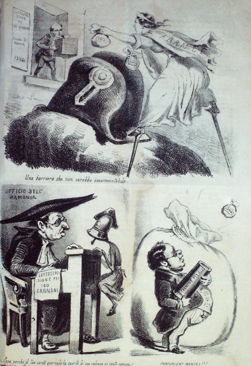 Serie di vignette. Prima vignetta: la Francia indossa i trampoli e, cercando di superare il capello di Napoleone III, porta dei sacchi di denaro a Daniele Manin, che l’aspetta.
