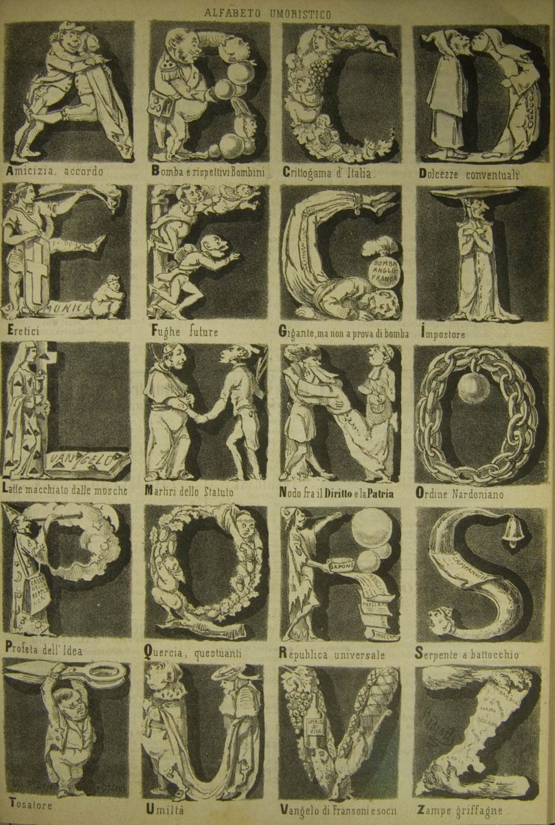 Nella vignetta che riproduce le lettere dell’alfabeto, alla “C” come “Crittogramma d’Italia” è raffigurata l’Italia turrita che come una vigna è attaccata da parassiti, tra i quali è in risalto il Papa.