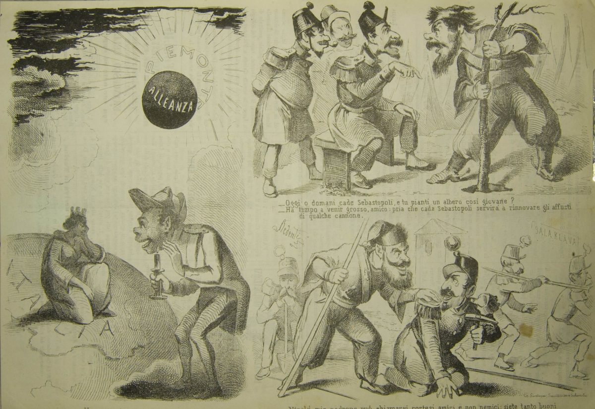Tre vignette, nella prima a sinistra è raffigurata l’Italia turrita. Mentre il sole del Piemonte è oscurato dall’alleanza con le potenze europee, un croato ride con una candela in mano, guardando l’Italia turrita che piange inginocchiata.