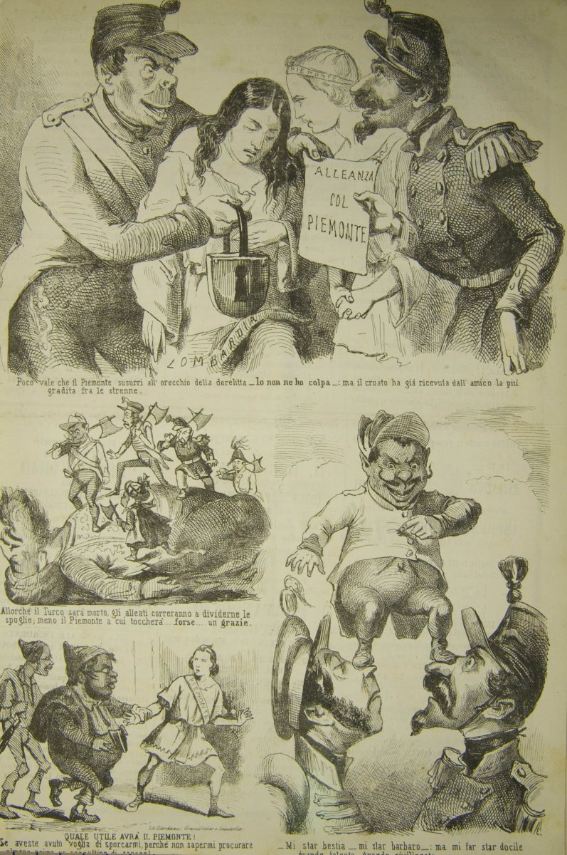 Quattro vignette: nella prima: un croato mette un lucchetto alla Lombardia, mentre un soldato francese gli porge un foglio con su scritto “alleanza con il Piemonte”. Sullo sfondo il Piemonte prova a consolare la Lombardia (in calce: “Poco vale che il Piemonte sussurri all’orecchio della derelitta – Io non ne ho colpa -: ma il croato ha già ricevuta dall’amico la più gradita delle strenne”); nella seconda: gli alleati austriaci, francesi e inglesi salgono sul cadavere del turco con le asce in mano; nella terza: Cavour e Rattazzi afferrano per un braccio il candido Piemonte, questa volta rappresentato come un ragazzo; nella quarta: un croato in equilibrio sui nasi di un inglese e di un francese.
