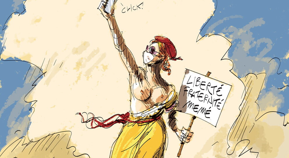 La Francia-Marianne ha il seno scoperto, indossa mascherina e occhiali da sole; è in posa per un selfie da propagare sul web come meme. Il riferimento è al ritiro delle truppe americane dall’Afghanistan e al  tentativo fallito di esportare la democrazia nel paese, visto il ritorno al potere dei talebani.
