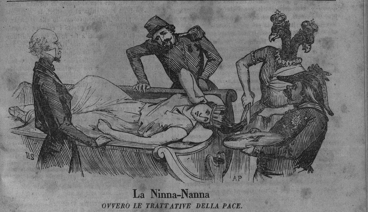 L’Italia turrita è stesa in una culla, mentre le potenze internazionali cercano di addormentarla ancora una volta.