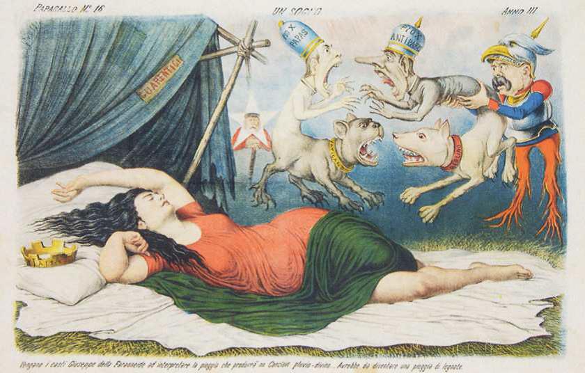 L’Italia ha la corona turrita posata sul letto; ha indosso una veste rosso-verde che con il bianco del lenzuolo formano il tricolore. L’Italia dorme e sogna che il conclave nomini un Papa e un Anti-Papa. Sullo stellone compare il volto di Garibaldi.