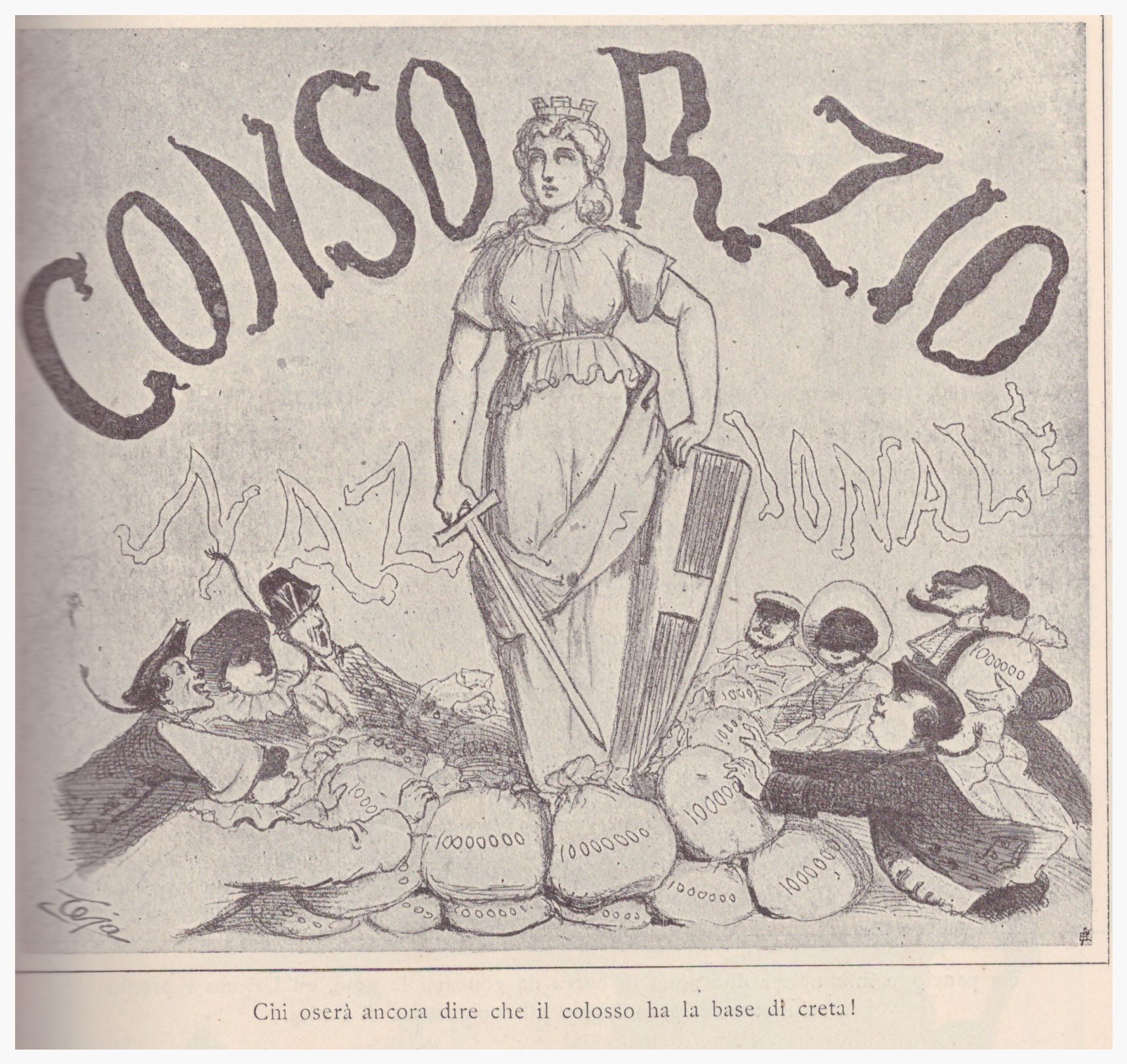 L’Italia turrita è in primo piano; sotto di lei sacchi di monete e le maschere delle diverse regioni italiane. La vignetta si riferisce alla creazione del Consorzio nazionale per estinguere il debito dello Stato. In calce: “Chi oserà dire che il colosso ha la base di creta!”