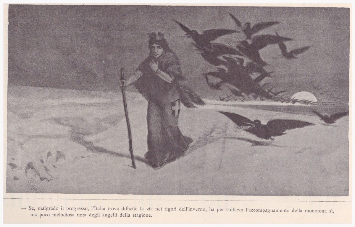 L’Italia turrita si trova ad affrontare un freddo inverno, caratterizzato da un’altra crisi di governo e da una situazione economico-finanziaria complicata. I corvi della politica la seguono nel cammino.