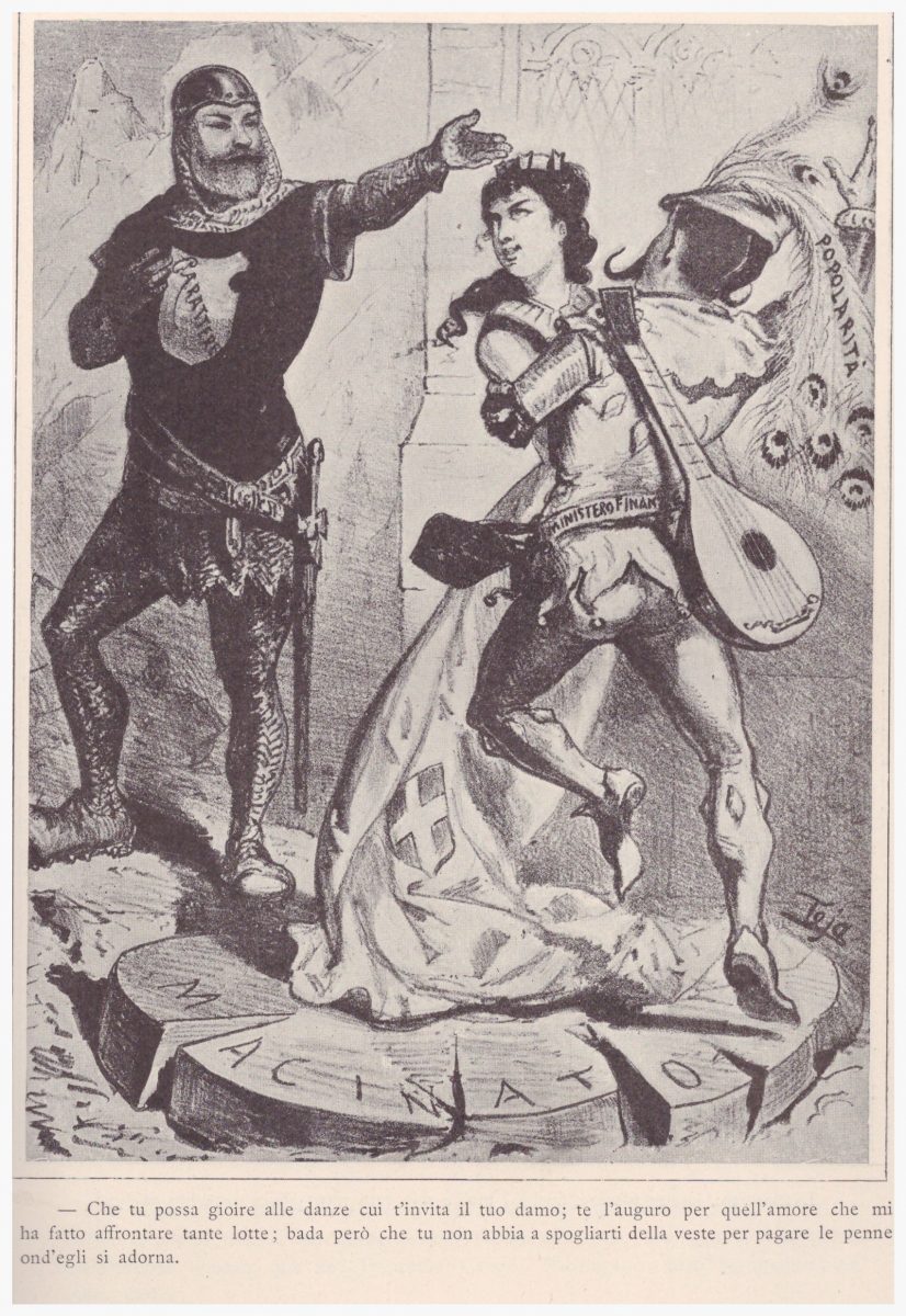 L’Italia turrita danza con il Ministro delle finanze Seismit-Doda, il quale ha ridotto la tassa sul macinato. Il cavaliere Sella ammonisce l’Italia, sperando che questa non debba soffrire del provvedimento adottato.