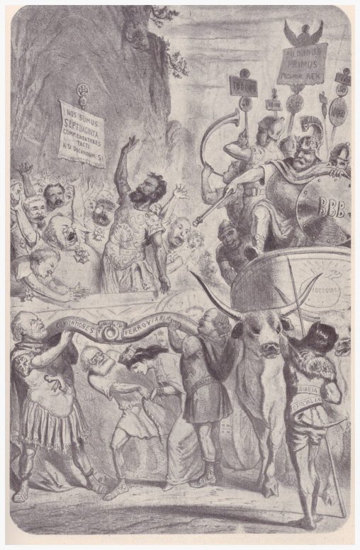 L’Italia turrita è costretta a passare sotto il giogo delle Forche Caudine delle convenzioni ferroviarie. L’Illustrazione fa riferimento alla concessione della rete ferroviaria nazionale a due società private.