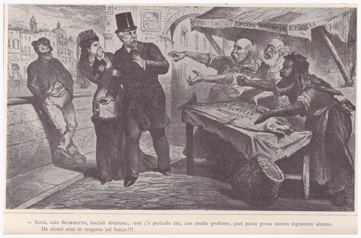 L’Italia turrita è al braccio di Benedetto Cairoli; i due non si lasciano confondere dalle offerte del banco del pesce della “panacea progressista” di Crispi, Depretis e Nicotera.