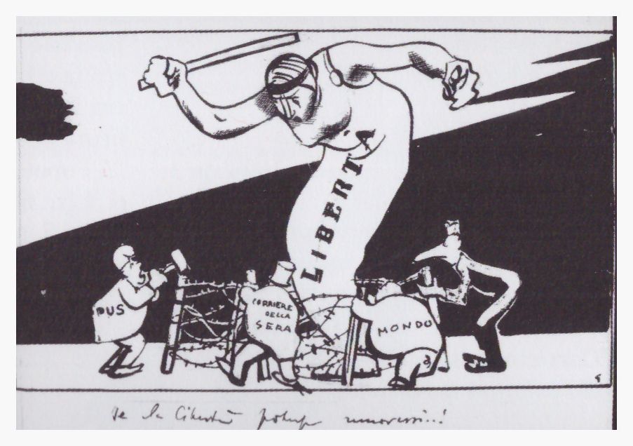 La figura femminile della Libertà e rinchiusa dentro un recinto di filo spinato dal «Corriere della Sera», «Il Mondo» e dal Partito Socialista Unitario.