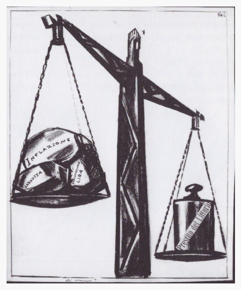 L’Italia turrita e stellata rappresenta una bilancia: su un piatto sta il “prestito del littorio” e sull’altro “l’inflazione”, “il carovita” e “la svalutazione della lira”. L’intento è incentivare il Prestito del Littorio.
