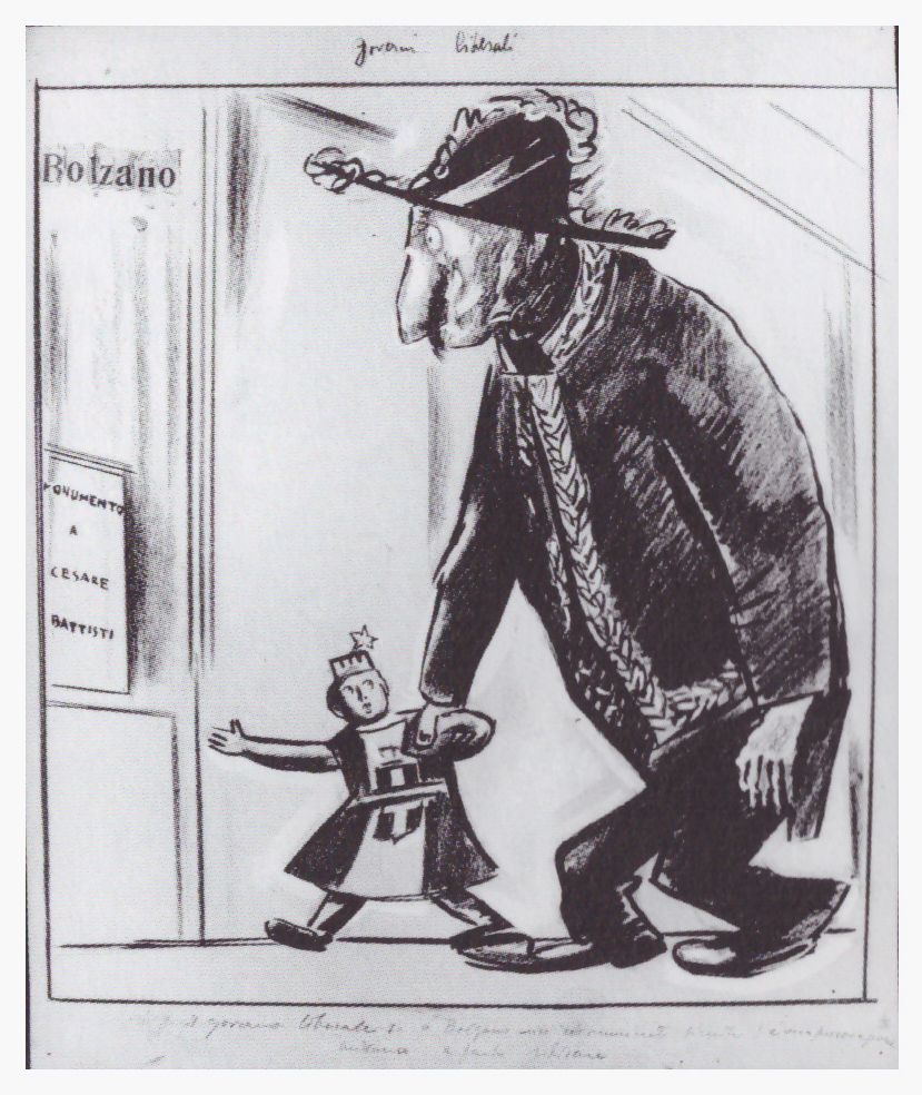 L’Italia bambina turrita e stellata tiene per mano un uomo anziano che rappresenta il governo liberale/Giovanni Giolitti. Entrambi si dirigono verso il monumento eretto a Bolzano in onore di Cesare Battisti. La provocazione è nei confronti della popolazione di lingua tedesca.