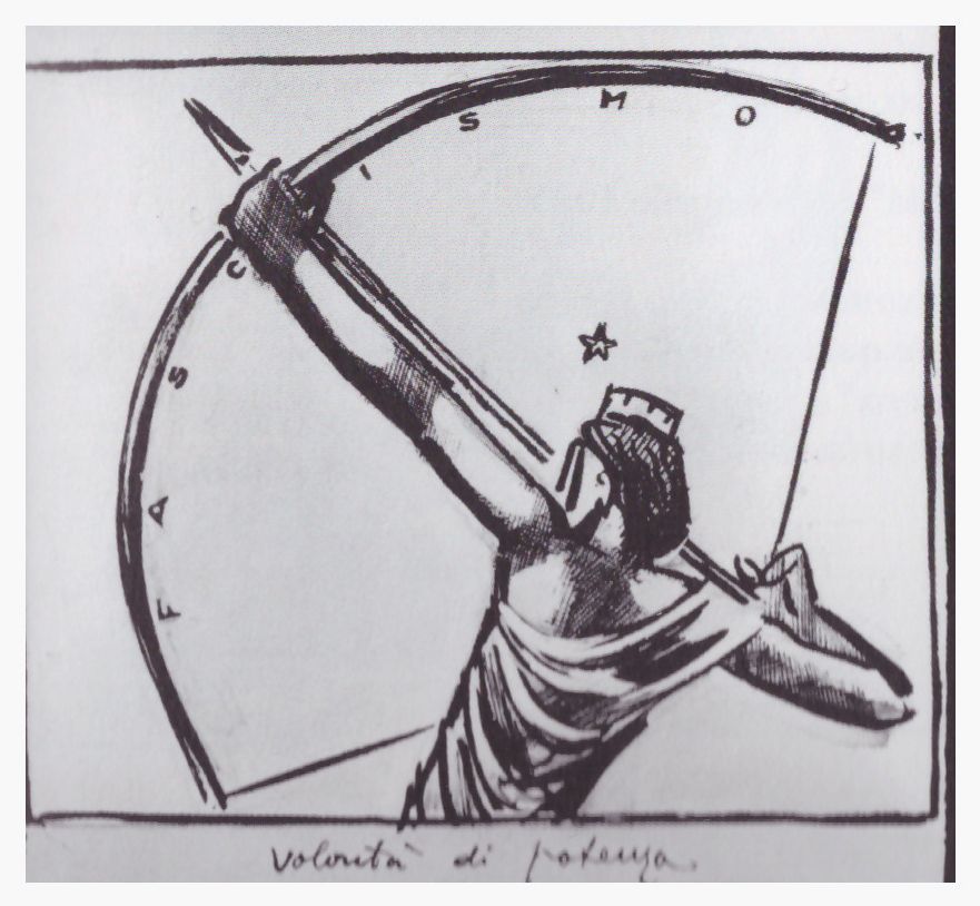 L’Italia turrita e stellata tende l’arco del fascismo, pronta a scoccare la freccia.
