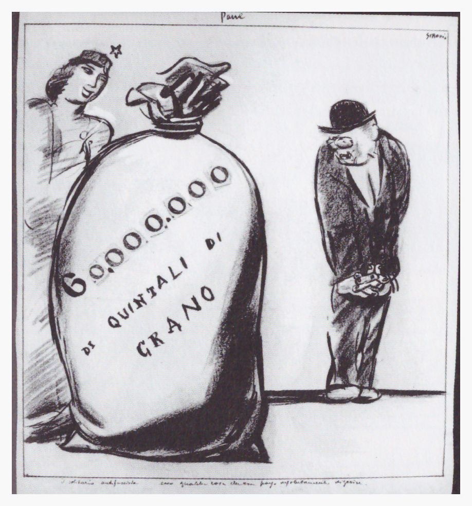 L’Italia turrita e stellata sorride di fronte ad un sacco che rappresenta la produzione di grano del paese. L’illustrazione si riferisce alla “battaglia del grano” e all’obiettivo dell’autosufficienza granaria.