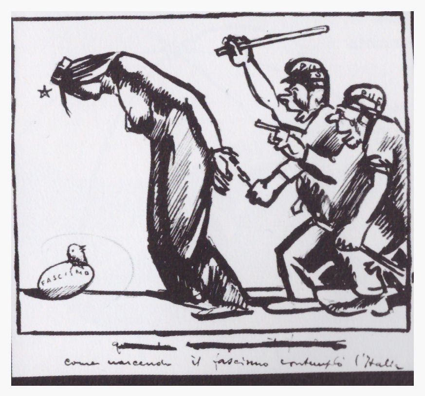 Il fascismo è rappresentato come un pulcino che sta uscendo dal guscio. Appena nato vede l’Italia turrita e stellata incatenata e bastonata da sostenitori del Partito socialista unitario.