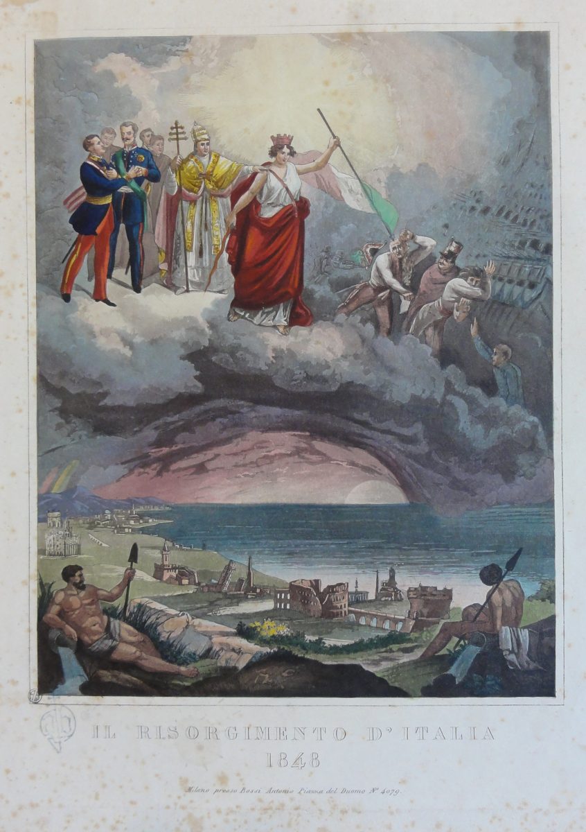 Al centro, l’Italia turrita stringe nella mano destra il bastone del comando e nella sinistra il tricolore, mentre caccia gli austriaci. In alto, sono rappresentati Pio IX, Carlo Alberto e Leopoldo di Toscana. In basso il Piemonte, la Lombardia e Roma sono simboleggiati dai principali monumenti.