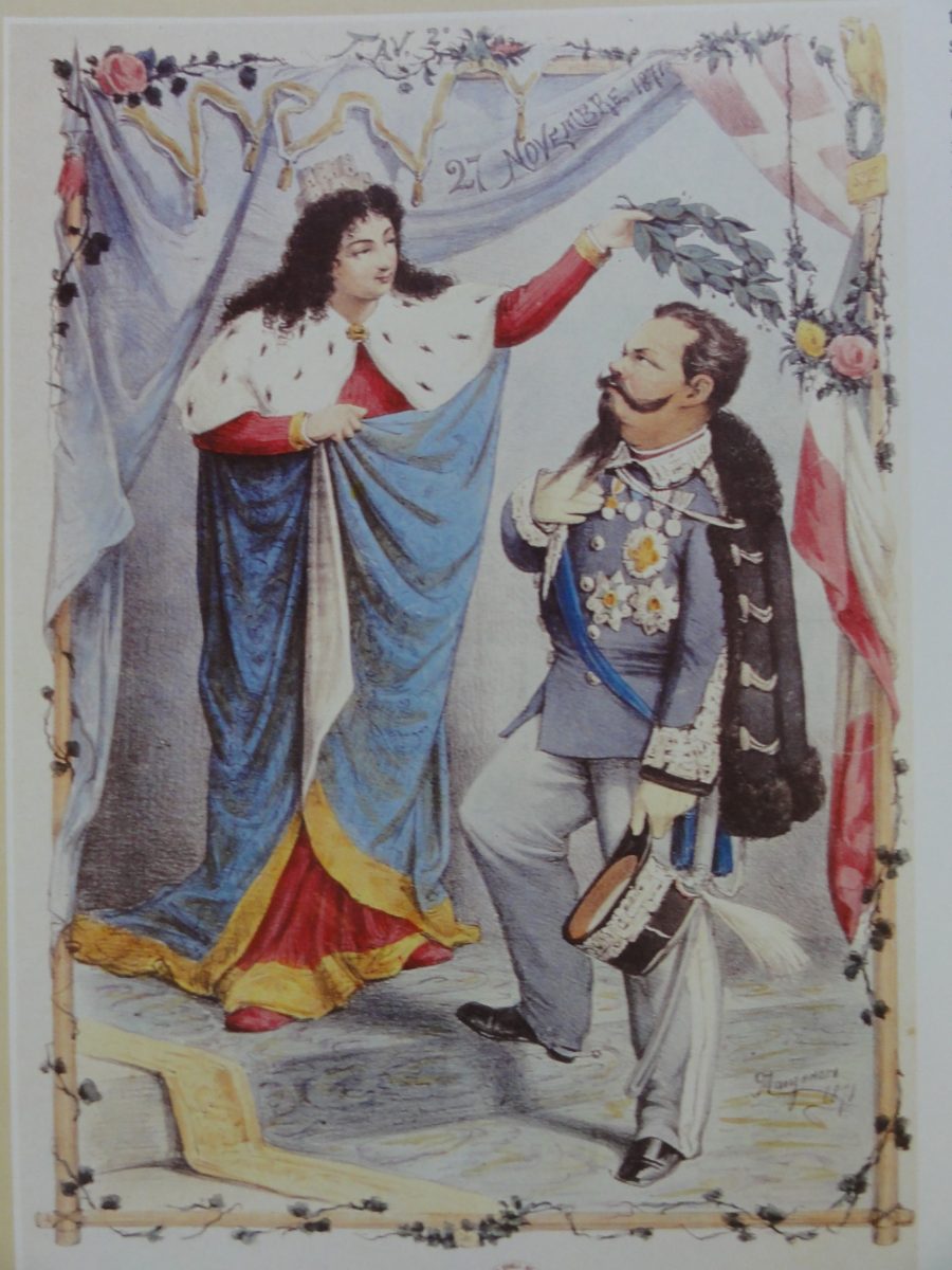 L’Italia turrita indossa un copri-spalle in pelliccia d’ermellino e un mantello blu Savoia. Pone sul capo del Re Vittorio Emanuele II una corona d’alloro. Il riferimento è all’apertura, per la prima volta nel Palazzo di Montecitorio, della seconda sessione della XI legislatura.