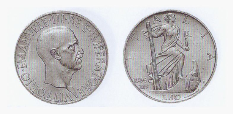 Emissione in argento; sul rovescio della moneta è raffigurata l’allegoria femminile dell’Italia su una prua di una nave, la quale è fregiata dello scudo sabaudo affiancato da due fasci littori. Italia tiene con la mano destra un fascio littorio e con la sinistra una piccola statua della Vittoria.