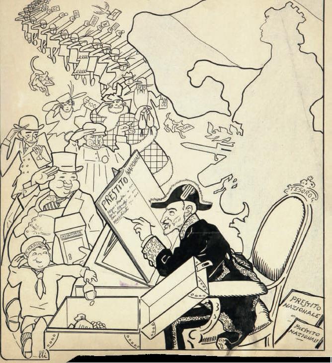 La sagoma dell’Italia turrita vigila sulla generosità degli italiani in fila per contribuire al prestito nazionale.