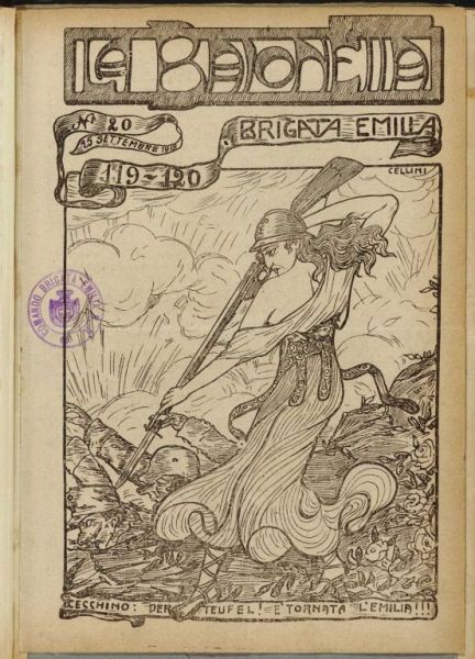 Una giovane donna corazzata e con elmo colpisce il nemico con una baionetta. La figura femminile rappresenta probabilmente la Brigata Emilia, della quale il giornale di trincea è il portavoce.