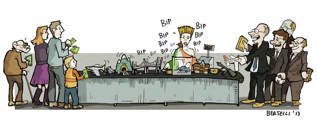 L’Italia turrita deve far fronte a chi chiede denaro (a destra) e alle spese per le opere pubbliche. A sinistra, i cittadini italiani versano invece denaro nelle casse del Paese.