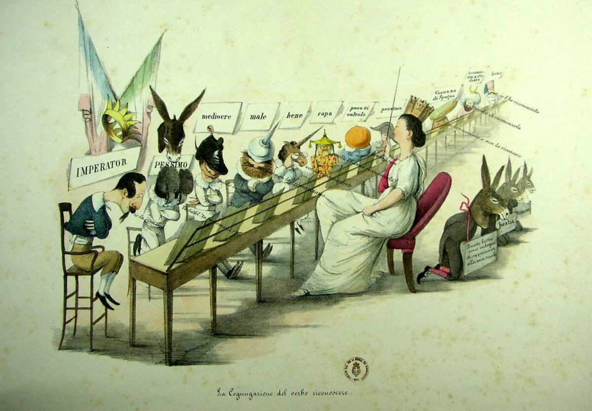 Il disegno esprime il comportamento dei governi europei a proposito del riconoscimento del Regno d’Italia. Le potenze europee devono coniugare il verbo riconoscere davanti all’Italia turrita, che le giudica.
