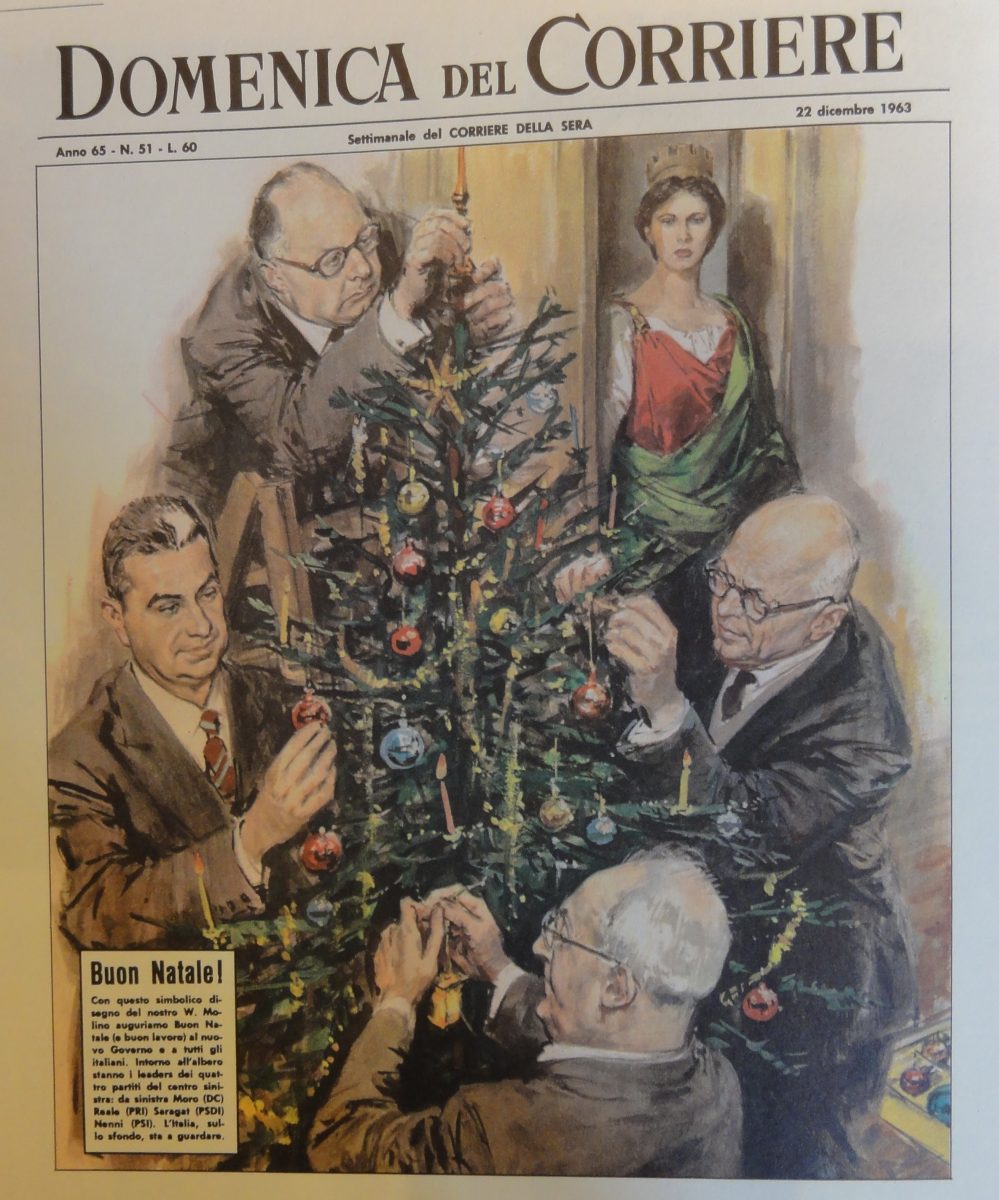 Raccolti intorno all’albero di Natale si trovano i leader dei quattro partiti del centro-sinistra: Moro, Reale, Saragat e Nenni. Sullo sfondo l’Italia turrita sta a guardare.