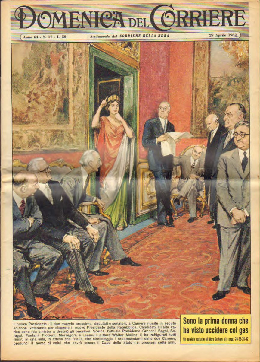 L’Italia turrita deve scegliere il nuovo Capo dello Stato. In calce: “Il due maggio prossimo deputati e senatori, a Camere riunite in seduta solenne, voteranno per eleggere il nuovo Presidente della Repubblica. Candidati all’alta carica sono (da sinistra a destra) gli onorevoli Scelba, l’attuale Presidente Gronchi, Segni, Saragat, Fanfani, Piccioni, Merzagora e Leone”.