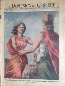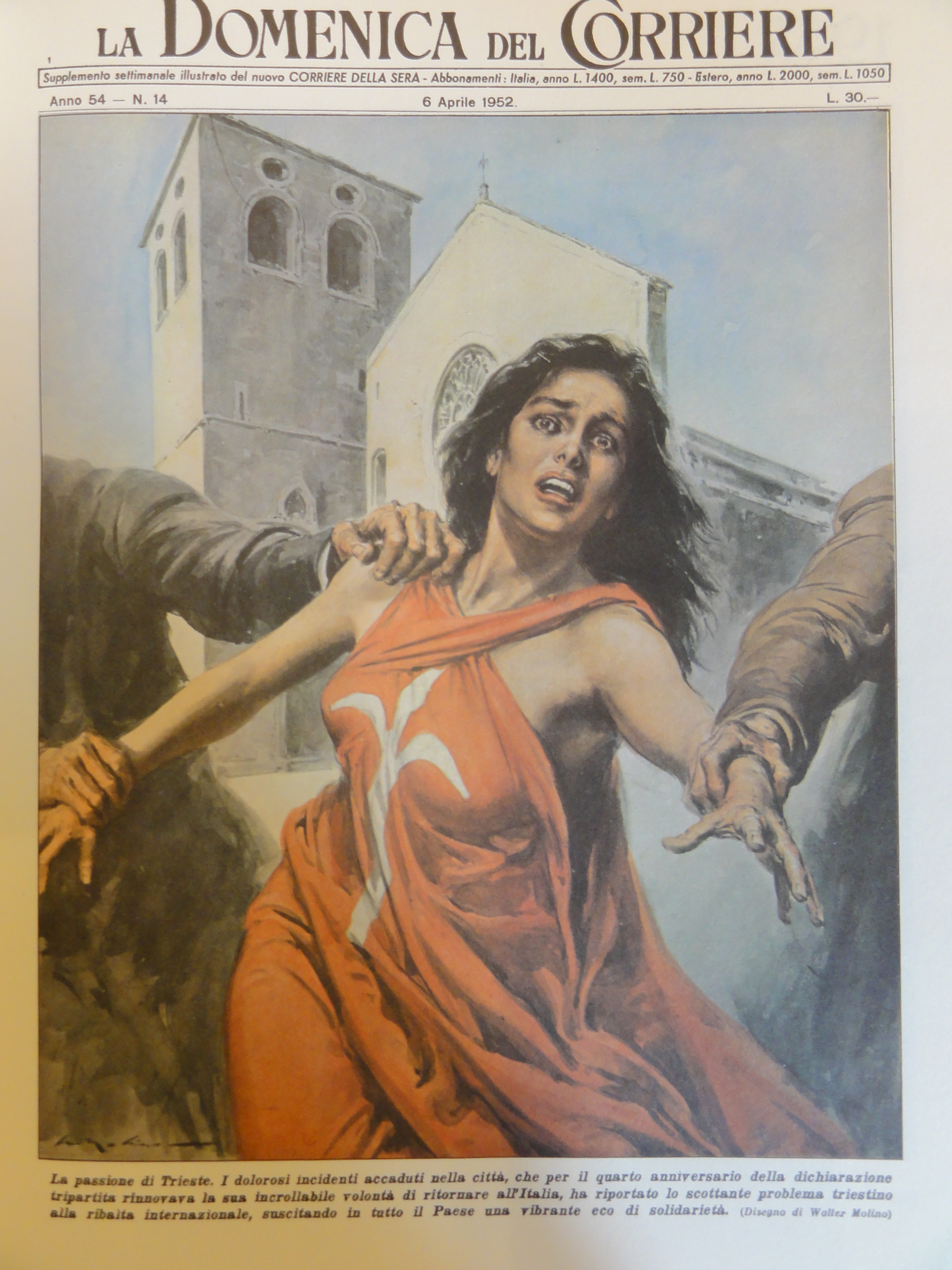 Trieste è rappresentata come una giovane donna, vestita con la bandiera della città, la quale appare sconvolta per la situazione di tensione che continua a caratterizzare la vita della città stessa. In calce: “La passione di Trieste. I dolorosi incidenti accaduti nella città, che per il quarto anniversario della dichiarazione tripartita rinnovava la sua incrollabile volontà di tornare all’Italia, ha riportato lo scottante problema triestino alla ribalta internazionale, suscitando in tutto il Paese una vibrante eco di solidarietà”.